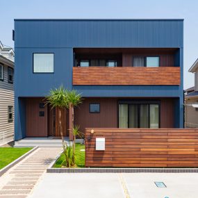 さわやかなブルーのカリフォルニア風外観に、木目調のおしゃれなバルコニーアクセントをプラス。